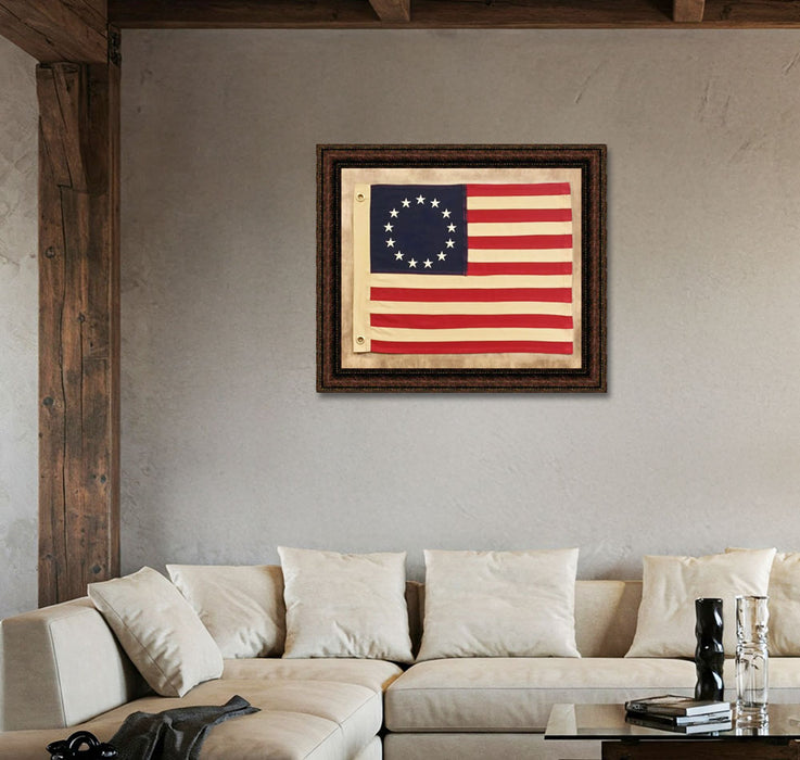 Framed Betsy Ross Flag with Grommets | Real Cotton Cloth Embroidered Flag | 25L X 29W" Inches