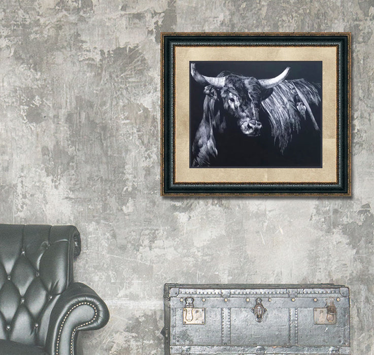 Brindle Bull Rodeo | Framed Cattle Art in Double Mat | 25L X 29W" Inches