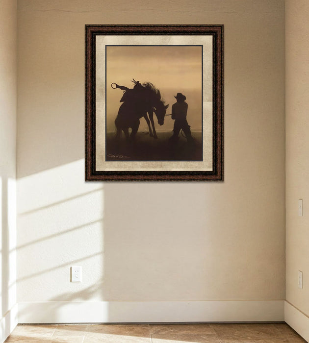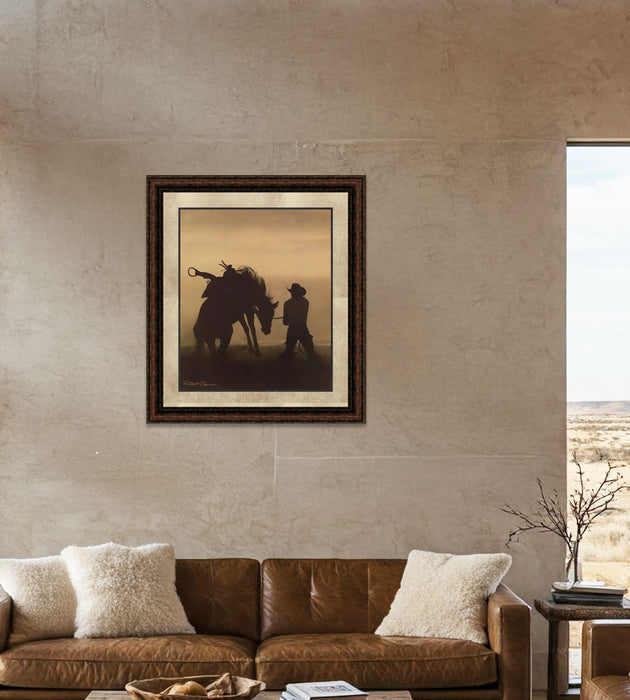 "Bucking Horse Silhouette" framed art with double mat, comes delivered ready to hang, with wire hangers included and no additional framing needed. We print on heavy stock art paper to ensure the highest quality results. Decorate your home or office with this high-quality art for many years to come.