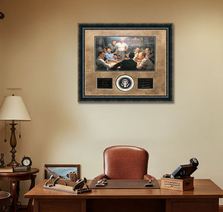 Another famous print from Missouri artist Andy Thomas, The Grand Ol' Gang shows former presidents playing a game of cards, seemingly at the convention. Here, Andy Thomas has chosen to include the likes of GHW Bush, Lincoln, Ford, Nixon, T. Roosevelt, Eisenhower, GW Bush, and Reagan. This high-quality Grand Ol' Gang print is framed with black and brass autographs, and gold textured molding.