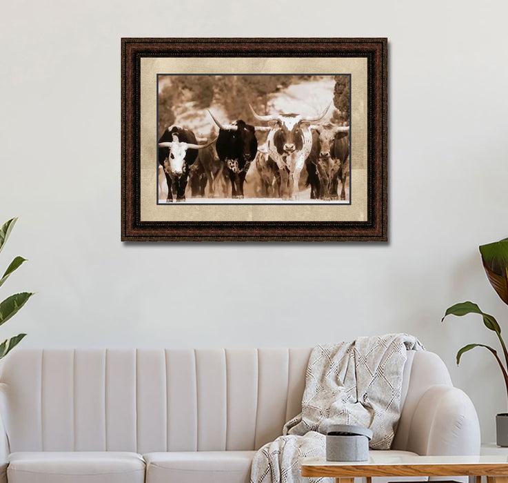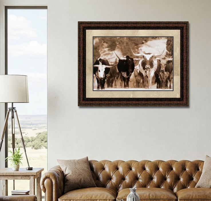 Longhorn Stampede | Western Framed Cattle Art in Double Mat | Various Sizes