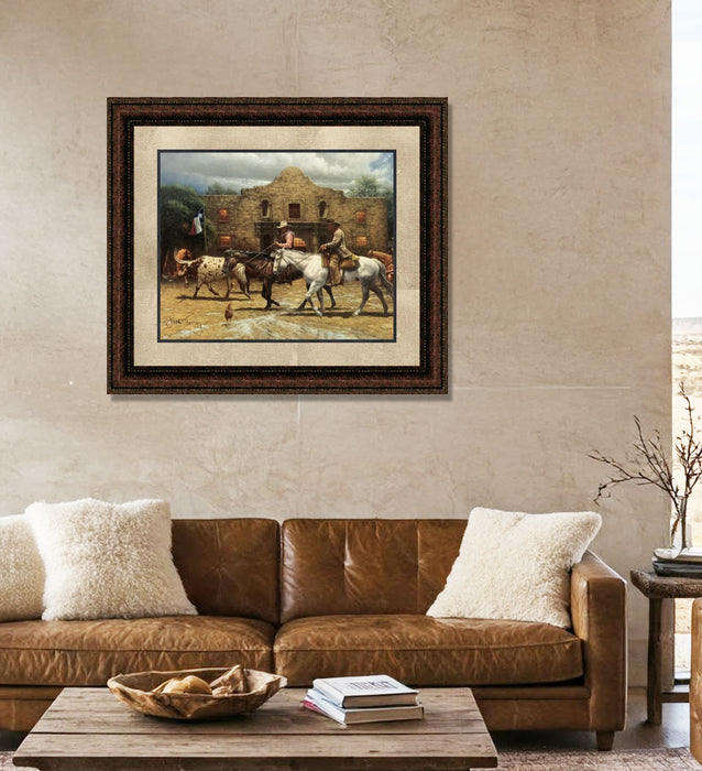 During the late 1800s, countless cattle were driven up the Chisholm Trail through San Antonio from south Texas to northern parts of the state. In this print, Texan artist Jack Terry shows how the cowboys would ride right through the middle of town, along with their Longhorn cattle. A familiar scene back then, these men were eager to hop off their horses and enjoy a drink and some dinner after a long day on the trails.