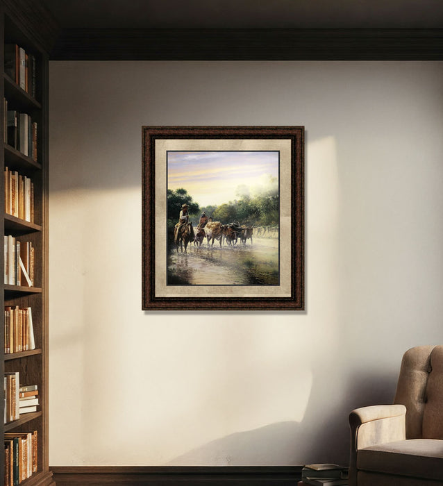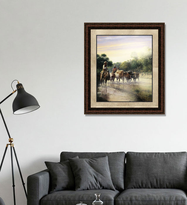 Born in 1952 in Sweetwater, Texas, Jack Terry began his successful art career as a young child, winning his first award at just nine years old. A sixth-generation Texan, he credits much of his inspiration to his grandparents. Terry's grandfather was a well-known rancher who helped on some of the final cattle drives of the west. Terry's grandmother started painting later in life, which meant she taught Jack various painting techniques from a young age. Our Picking Up Strays print features a wooden frame and a double mat.